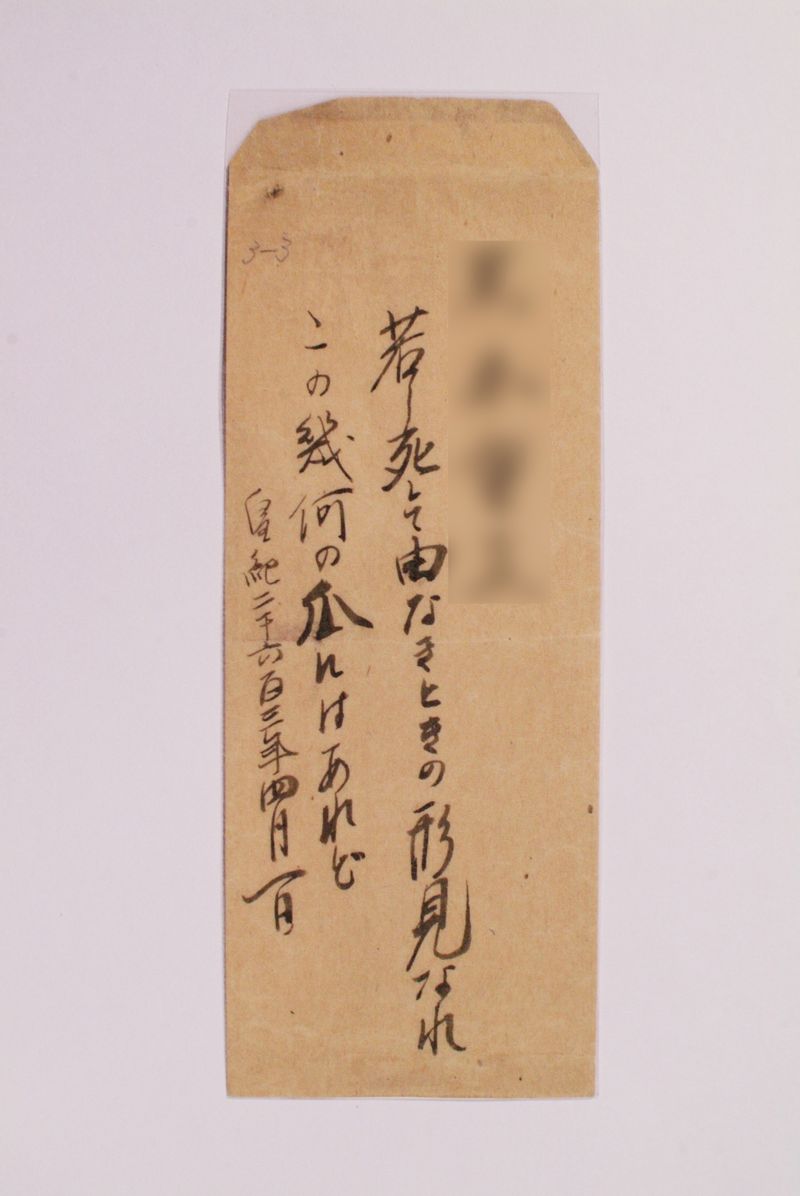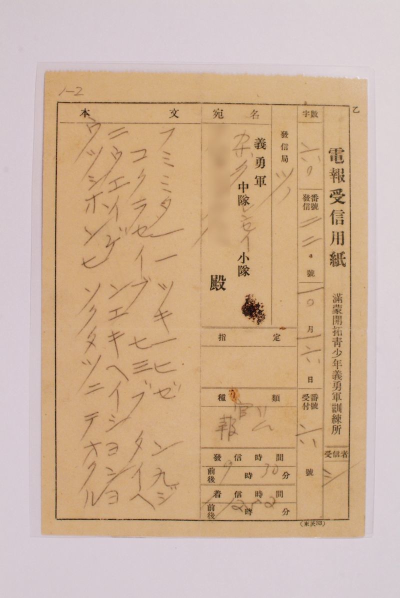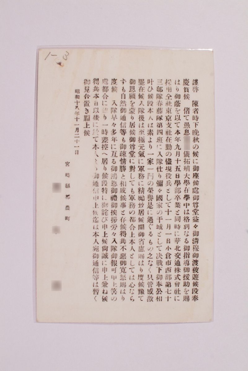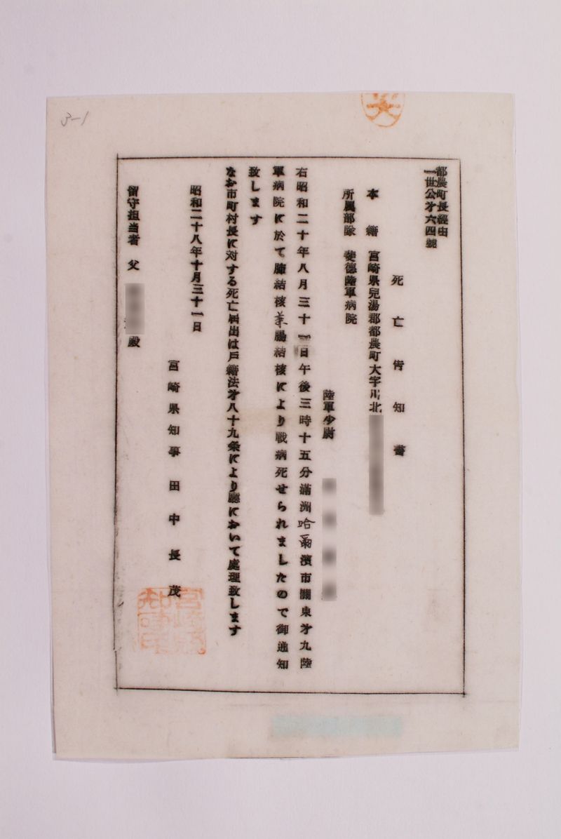 文字サイズ 標準 / 拡大 平和祈念資料展示室 ホーム > 平和祈念資料展示室 > 戦没した陸軍軍人の父 戦没した陸軍軍人の父 大学卒業後、満蒙開拓青少年義勇軍の幹部・指導者要員として満州に渡る。 昭和18年11月1日、召集を受け小倉西部第73部隊に入営。幹部候補生に合格して将校となるが、終戦直後の8月31日にハルピンの陸軍病院で戦病死。 終戦の混乱の中、父親は満州の知人たちに手紙を通して息子の消息を尋ねまわったが、「息子さんの墓標を見た」との返信が届き、息子の死を受け止めざるを得なかった。 画像をクリックで拡大 遺書 満蒙開拓青少年義勇軍の幹部・指導者要員として満州に渡る直前、決意を示した和歌と遺爪を残した。皇紀2603年は昭和18年(1943)。 画像をクリックで拡大 電報 小倉西部第73部隊へ入営するために必要な現役兵証書の写しを速達で送る、と知らせた都農の父親からの電報。 画像をクリックで拡大 挨拶状 入営の挨拶状を、父親が本人に代わって出したもの。 息子本人から連絡があるまで、通信を見合わせる願いで文が結ばれている。 画像をクリックで拡大 大学在学中と陸軍少尉時の写真 画像をクリックで拡大 軍事郵便葉書 昭和20年3月、満州の部隊から母親宛に送ったもので、還暦を迎えた母親を讃える和歌が詠まれている。 画像をクリックで拡大 死亡告知書 昭和20年8月31日、満州ハルピンの陸軍病院にて肺結核のため戦病死。当時、満州はソ連軍政下にあったため、死亡の通知が伝わらなかった。 戦後、復員者の情報により死亡が判明、昭和28年10月31日付けで県知事から告知書が届いた。 一覧に戻る