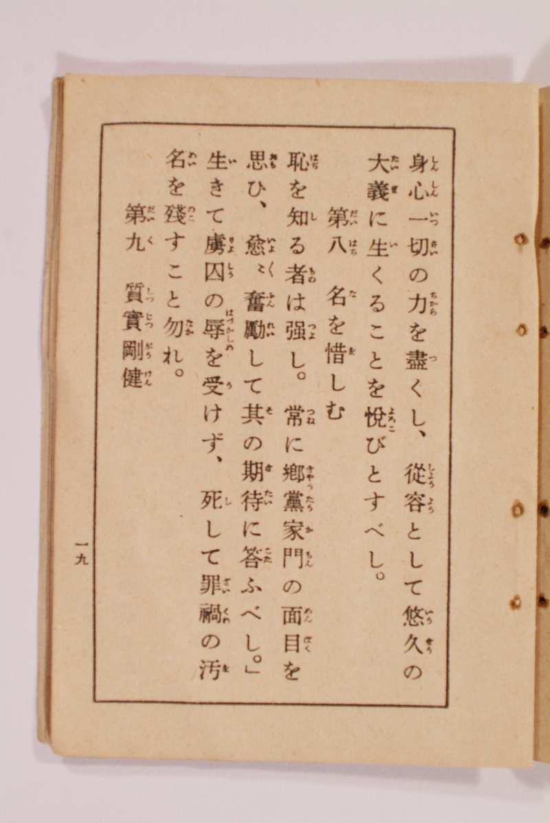 文字サイズ 標準 / 拡大 平和祈念資料展示室 ホーム > 平和祈念資料展示室 > 典範令 典範令 陸軍の各兵科に共通するのが軍隊内務令や陸軍礼式令などで、各兵科ごとにある操典、各兵科の中の技術的な内容である教範、これらを総称して典範令と称した。 画像をクリックで拡大 戦陣訓 昭和16年(1941)1月8日、東條英機陸相が示達した戦場における軍人の具体的行動の準拠を示した文書。第八に「生きて虜囚の辱めを受けず」がある。 画像をクリックで拡大 歩兵全書 歩兵科に関する全般的な解説書。作戦要務令、軍隊符号、諸兵射撃教範などが所収されている。 画像をクリックで拡大 輜重兵操典 前線の部隊に弾薬、物資などの補給品を運搬する輜重兵科の基礎的な教則本。 一覧に戻る