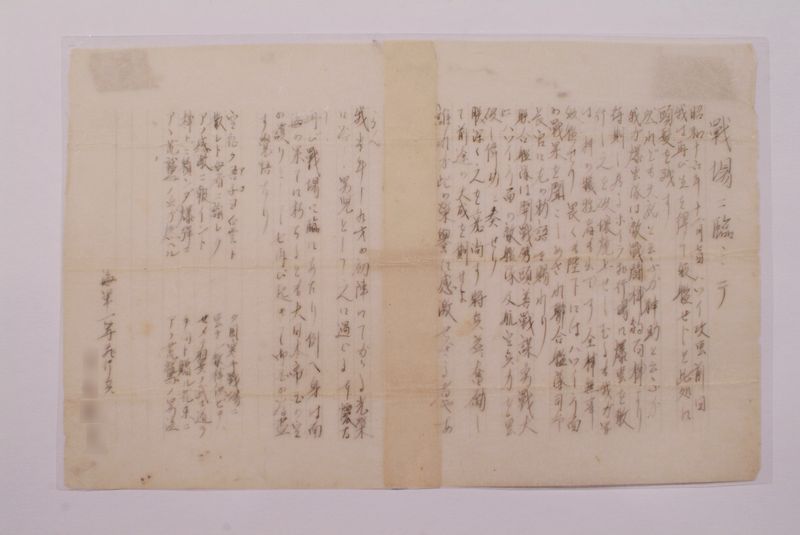 文字サイズ 標準 / 拡大 平和祈念資料展示室 ホーム > 平和祈念資料展示室 > 遺書 遺書 画像をクリックで拡大 遺書と写真 昭和16年(1941)12月7日、ハワイ真珠湾攻撃に出撃する前日に書いた「戦場ニ臨ミテ」。 「我は、再び生を得て帰還せじと、ここに頭髪を残す」とある。 画像をクリックで拡大 遺書 妻に宛てたもので、戦死後の妻を案ずる気持ちが述べられている。 最終行の「胸の中が熱い血管の為字が書けぬ」が印象的である。 一覧に戻る